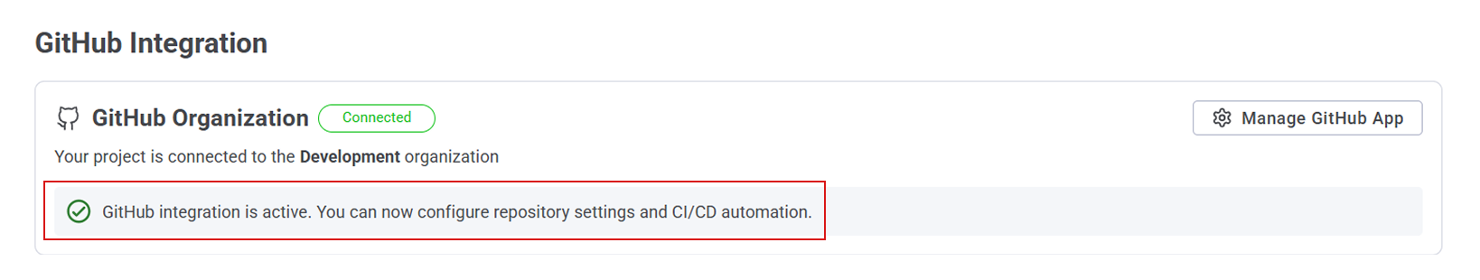 In the GitHub Integration section, click Connect to GitHub Organization under GitHub Organization.